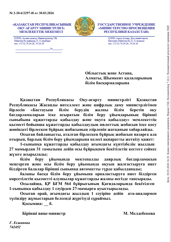 Бастауыш білімнің жалпы білім беретін оқу бағдарламаларын іске асыратын білім беру ұйымдарының 1-сыныбына қабылдау басталады.